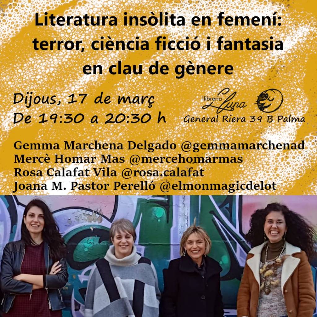 Dia 17 de març de 2022 Mercè Homar Mas, Gemma Marchena Delgado, Rosa Calafat Vila i servidora vam participar a una taula rodona sobre “Literatura insòlita en femení: terror, fantasia i ciència ficció en clau de gènere” a la Llibreria Lluna, de la mà de na Maria Barceló.