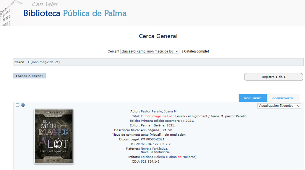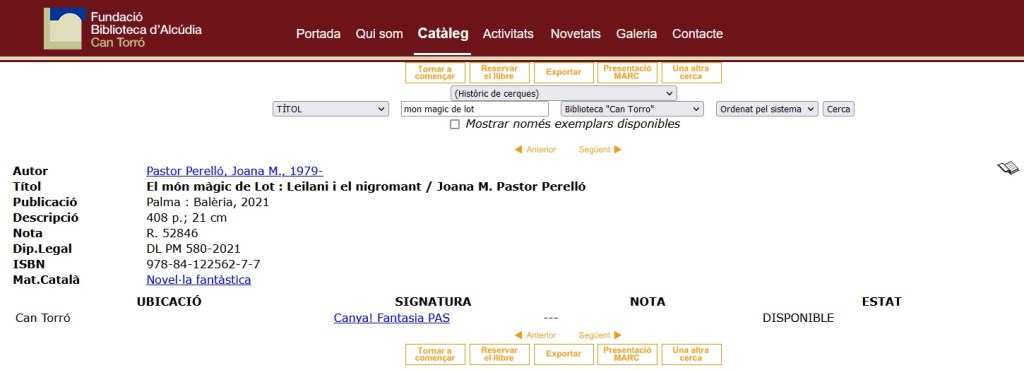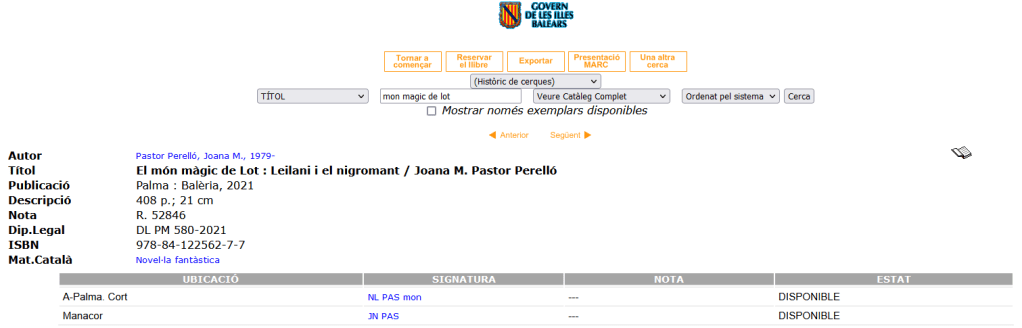 Vam començar per la Biblioteca de Cort, seu mare de les Biblioteques municipals de Palma. A continuació també vam lliurar a la Bibilioteca de Can Sales un exemplar d’El món màgic de Lot: Leilani i el nigromant. Sortint de Palma, el cotxe es fa imprescindible i anam cap a Llevant. L’alegria fou monumental en retrobar els companys i companyes de la Biblioteca de Manacor (no pareix possible però ja fa 9 anys que hi vaig fer feina!). Continuàrem cap a Can Torró, a Alcúdia, una biblioteca que feia pentura 25 anys que no trepitjava però de la qual en guard molt bon record, d’anar-hi de nina. Això sí que ha estat com travessar un portal i entrar a un altre món! Finalment, tornant cap a Ciutat, no podíem oblidar-nos del Centre Coordinador de Biblioteques del Consell de Mallorca.